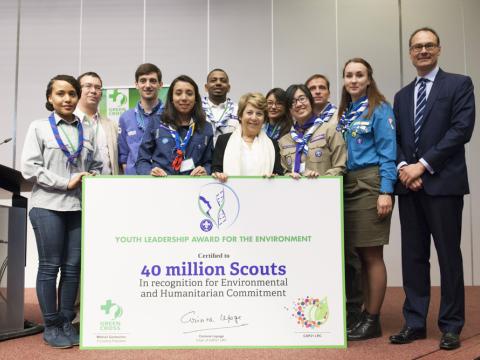 40-مليون كشاف من جميع أنحاء العالم يكرمون اليوم في (جائزة القيادات الشابة للبيئة) لتفانيهم في حماية البيئة وذلك في مؤتمر الصليب الأخضر الدولي للأخضر والاقتصاد الشامل.
