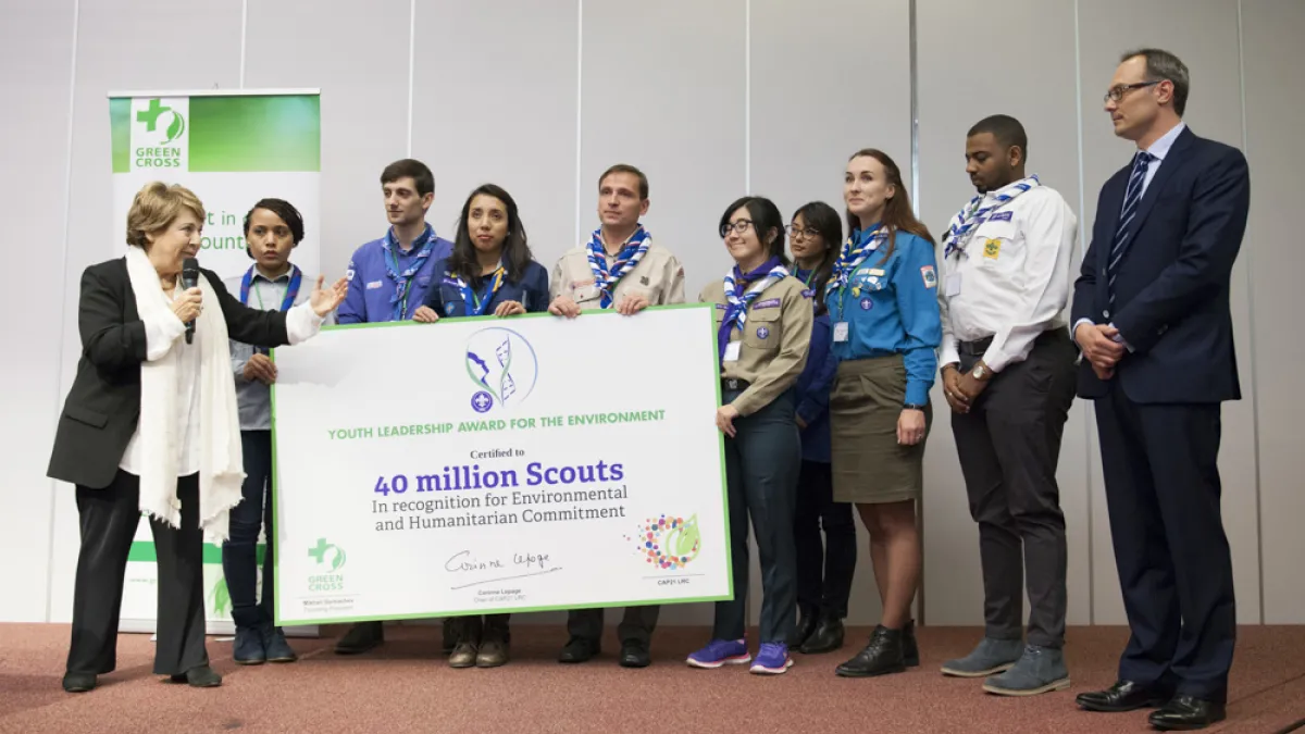 ومثل ستة من الكشافين 40 مليون كشاف من220 دولة ومقاطعة في العالم استلموا الجائزة من ممثل الرئيس المؤسس لجمعيات الصليب الأخضر الدولي ميخائيل جورباتشوف جنب إلى جنب مع كورين لوباج رئيس CAP21 ومستشار الرئيس فرانسوا أولاند لحقوق الإنسان.
