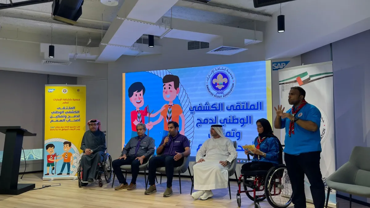 انطلقت اليوم فعاليات الملتقى الكشفي الوطني لدمج وتمكين أصحاب الهمم من منصة SAP من أمام ساحة الوصل بـ دبي بمشاركة 150 من أصحاب الهمم من مؤسسة زايد العليا لأصحاب الهمم ونادي دبي لأصحاب الهمم ومدينة الشارقة لأصحاب الهمم ونادي رأس الخيمة لأصحاب الهمم.
