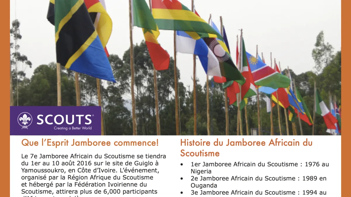 Le 7e Jamboree Africain du Scoutisme se tiendra du 1er au 10 Août 2016 à Yamoussoukro, en Côte d'Ivoire. L'événement, organisé par la Région Africaine du Scoutisme et hébergé par la Fédération Ivoirienne du Scoutisme, devrait attirer plus de 6 000 participants de l'Afrique et au-delà.