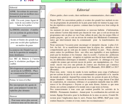 La dynamique Amahoro-Amani est mise en action par les associations des scouts et celles des guides des pays des grands lacs. C’est une collaboration exemplaire de l’Organisation Mondiale du Mouve- ment Scout (OMMS) et de l’Association Mondiale des...