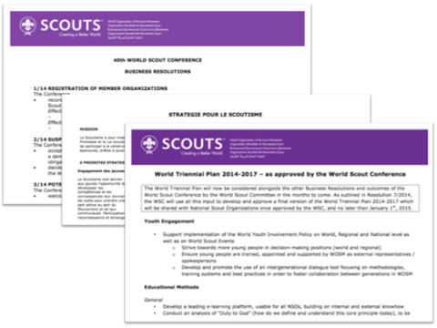 Les résolutions de travail, la nouvelle stratégie et le plan triennal 2014-2017, tous issus de la 40ème Conférence Mondiale du Scoutisme (Ljubljana, août 2014) sont maintenant disponibles sur le site web de l'Organisation Mondiale du Mouvement Scout...