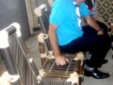Inside the factory, Scouts showed Geoghegan some musical instruments made of bamboo. They also showed a traditional food in Indonesia with bamboo shoots as the major ingredient.