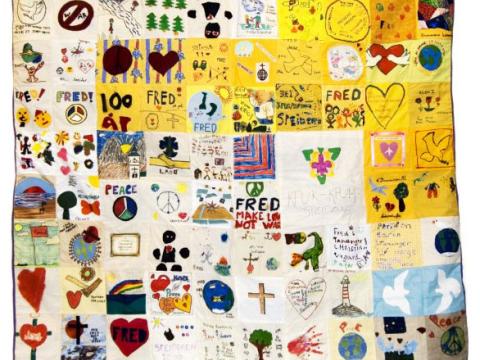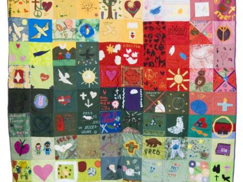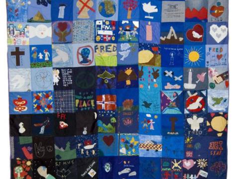 Norwegian Scouts and Guides took part in the Gifts for Peace by making an enormous peace quilt. Each patch in the peace quilt was made by a group of 5-10 Scouts and Guides. They decorated these with their wishes for the future, and the majority chose a peace theme. More than 5000 patches were submitted and the final result is a peace quilt made out of 600 patches. For practical reasons, the quilt is divided into 6 sections, each of 2x2 metres.