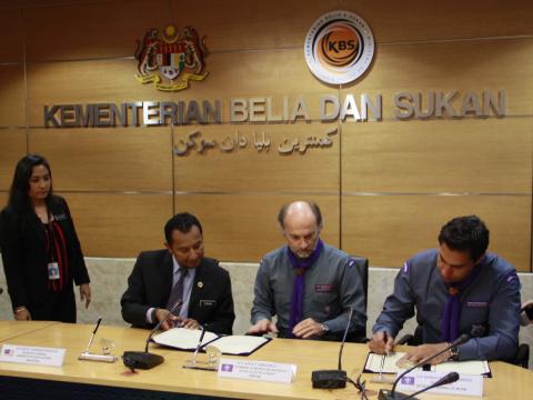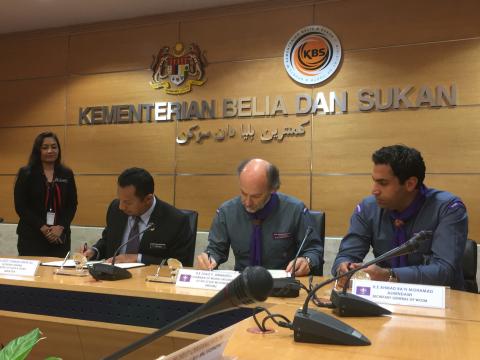 The Secretary General of the Malaysian Ministry of Youth and Sports, Dato Lokman Hakim Ali signed on behalf of the Government of Malaysia in a ceremony witnessed by the Malaysian Chief Commissioner and Assistant Chief Commissioners, as well as World Scout Bureau (WSB) staff. “The Government of Malaysia is proud to have WOSM’s Global Support Centre housed in Kuala Lumpur and will ensure that all support is extended to facilitate its noble mission,” said Dato Hakim.