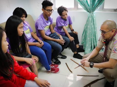 The camp gathered more than 60 children from diverse backgrounds – a handful of Senior Scouts from the Boy Scouts of the Philippines, children with learning disabilities, indigenous peoples, and street children or the out-of-school youth. The activities in the camp being facilitated by professional Scout leaders from the National Headquarters of the Boy Scouts of the Philippines, teaching the children basic skills in Scouting, including knot tying and lashing, first aid and bandaging, compass reading, fire safety, survival cooking and basic AR/CPR.