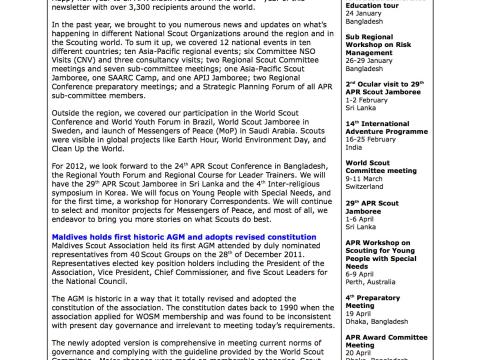 Maldives Scout Association held its first historic AGM, attended by duly nominated representatives from 40 Scout Groups, on the 28th of December 2011. Representatives elected key position holders including the President of the Association, Vice...